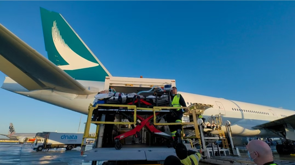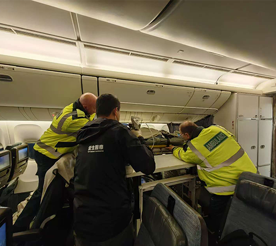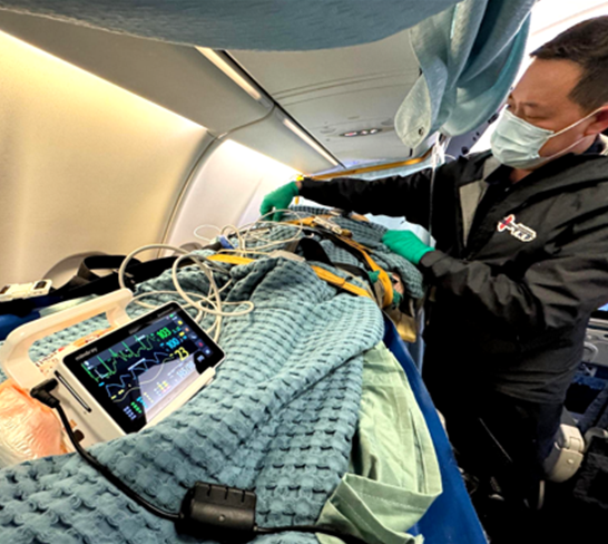 During the flight, the nursing team carefully adjusts IV and sedation plans, maintaining patient stability across continents.